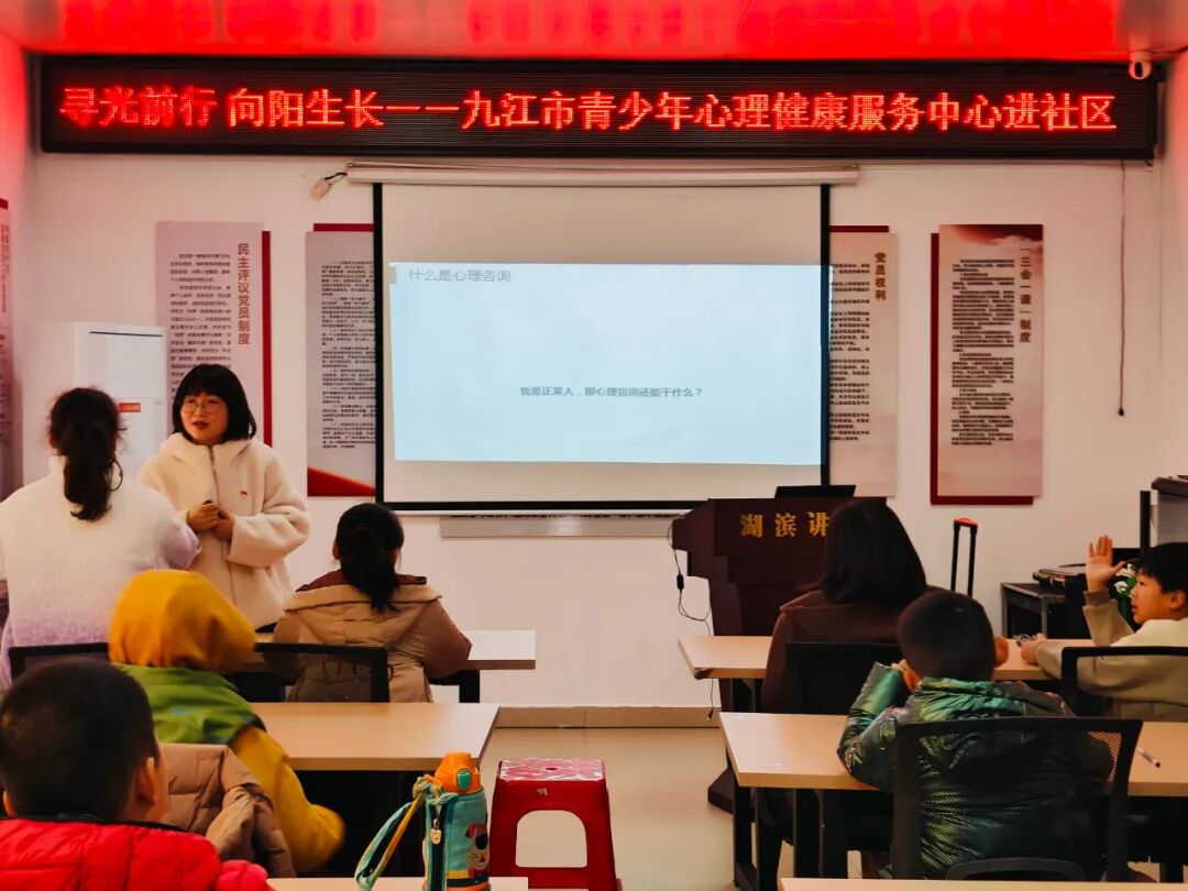 为扎实推进青少年心理健康服务,筑牢青少年心理健康防线,加大青少年心理健康科普宣传力度,提升青少年心理健康素养。1月21日下午,九江市青少年心理健康服务中心走进浔阳区湖滨社区开展“寻光前行 向阳生长”心理健康知识宣讲进社区活动。